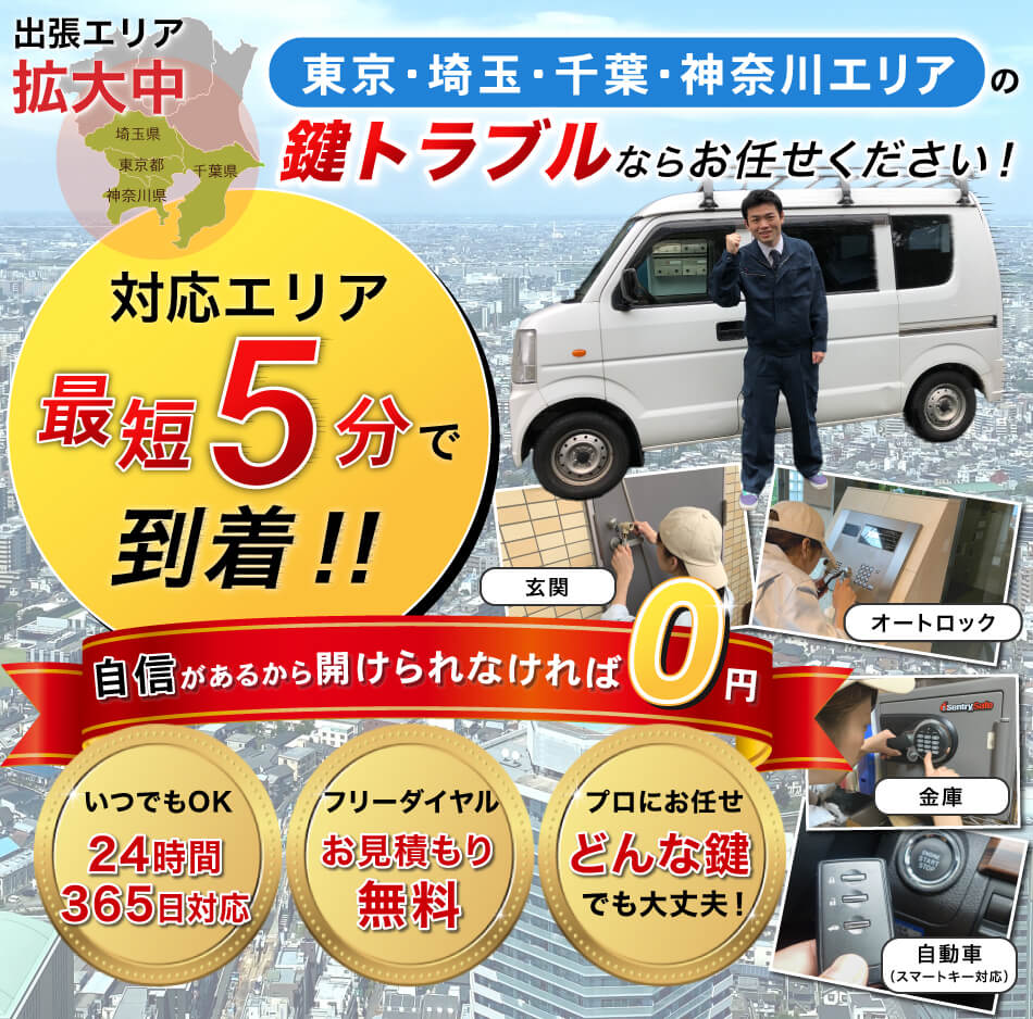 東京、神奈川、千葉、埼玉エリアに錠前技師を配置し、いつでもお客様のもとへ最短で向かえるようにしています。