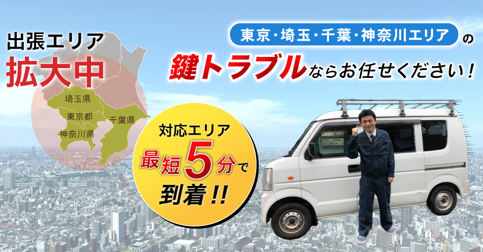 東京、神奈川、千葉、埼玉エリアに錠前技師を配置し、いつでもお客様のもとへ最短で向かえるようにしています。