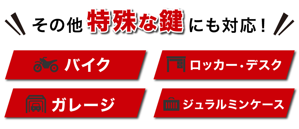 なお、鍵の交換などもその場で対応できるよう常に車に大量の鍵を積んで走っていますので鍵の交換や修理などでもその場ですぐに対応可能です。